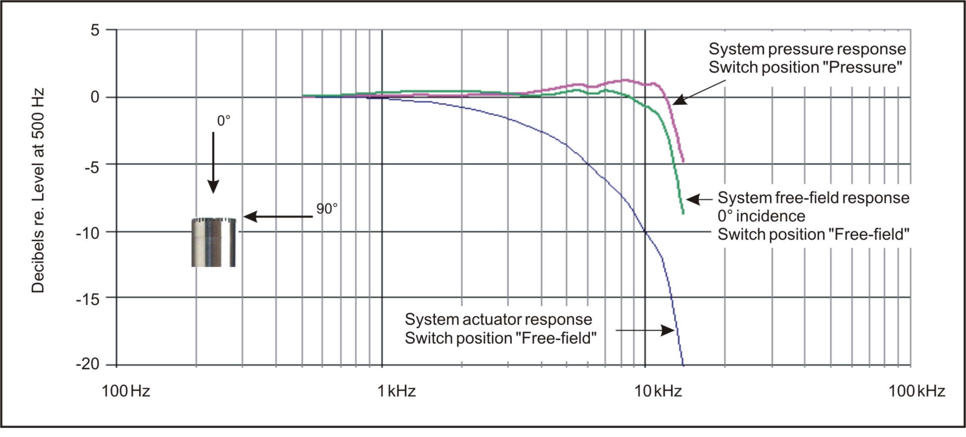 The chosen power supply has a two-position switch for selecting which microphone operation to use, i.e. pressure or free-field. A typical free-field response for an angle of incidence of 0 ° is shown in the data sheet when the GRAS 40HF is switched to free-field operation. Also shown in the data sheet is a complete low-noise measuring system, a typical noise floor in 1/3-octave bands for both the linear and A-weighted cases.