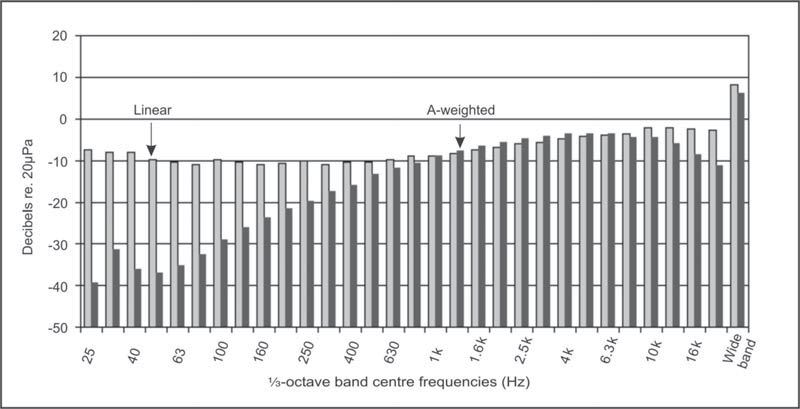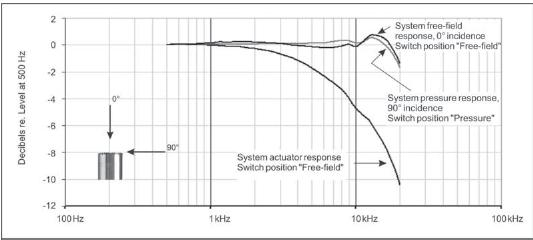 The chosen power supply has a two-position switchfor selecting which microphone operation to use, i.e.pressure or free-field. A typical free-field response for an angle of incidence of 0 ° is shown in the data sheet when the 40HT is switched to free-field operation. Also shown is a complete low-noise measuring system, a typical noise floor in 1/3-octave bands for both the linear and A-weighted cases.