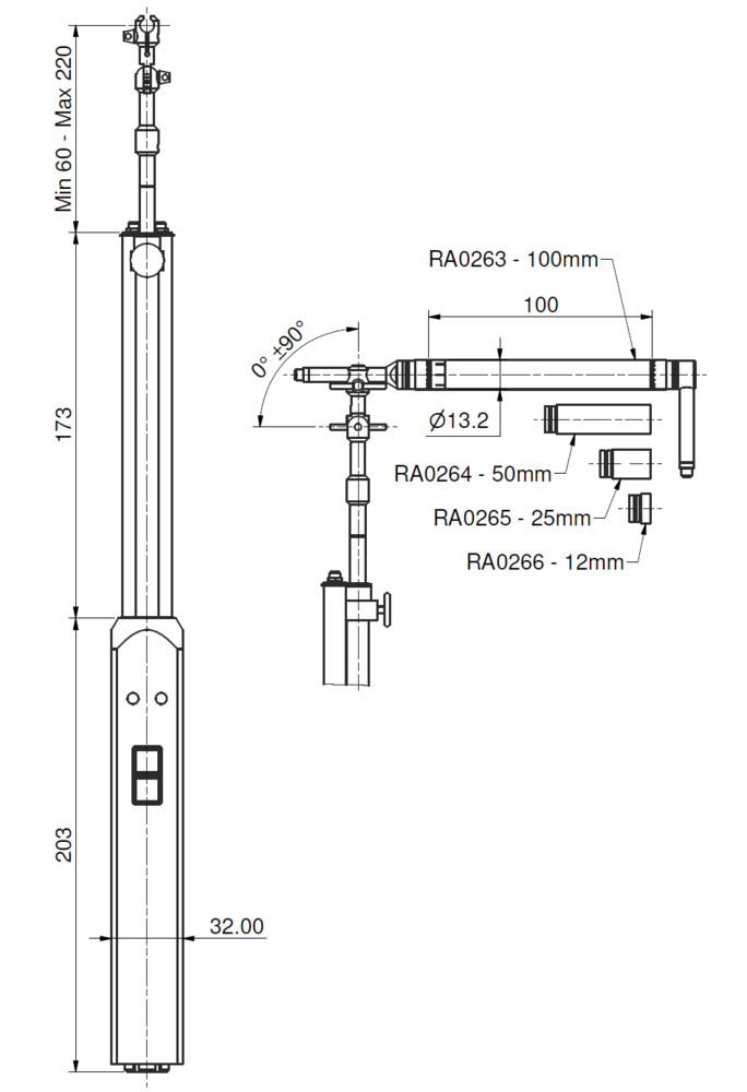 The microphones and preamplifiers are mounted on a swivel head on the telescopic arm of the Remote control handle. To cover the full frequency range from 50 Hz to 10 kHz, the 50GI-R probe is delivered with four solid spacers for spacing the microphones at 12 mm, 25 mm, 50 mm and 100 mm. These spacers can be easily interchanged without dismantling the probe.