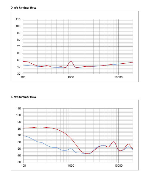 Các đồ thị minh họa tác động của tấm chắn nhiễu loạn GRAS 67TS lên nhiễu loạn lớp biên được đo ở các tốc độ dòng chảy tầng khác nhau. Trục Y là mức độ nhiễu loạn tính bằng dB SPL và trục X là tần số tính bằng Hz. Đường màu đỏ là kết quả khi không có tấm chắn nhiễu loạn, đường màu xanh là kết quả khi có tấm chắn nhiễu loạn. Mức độ nhiễu loạn giảm tới 25 dB khi có tấm chắn nhiễu loạn (tùy thuộc vào tốc độ gió).