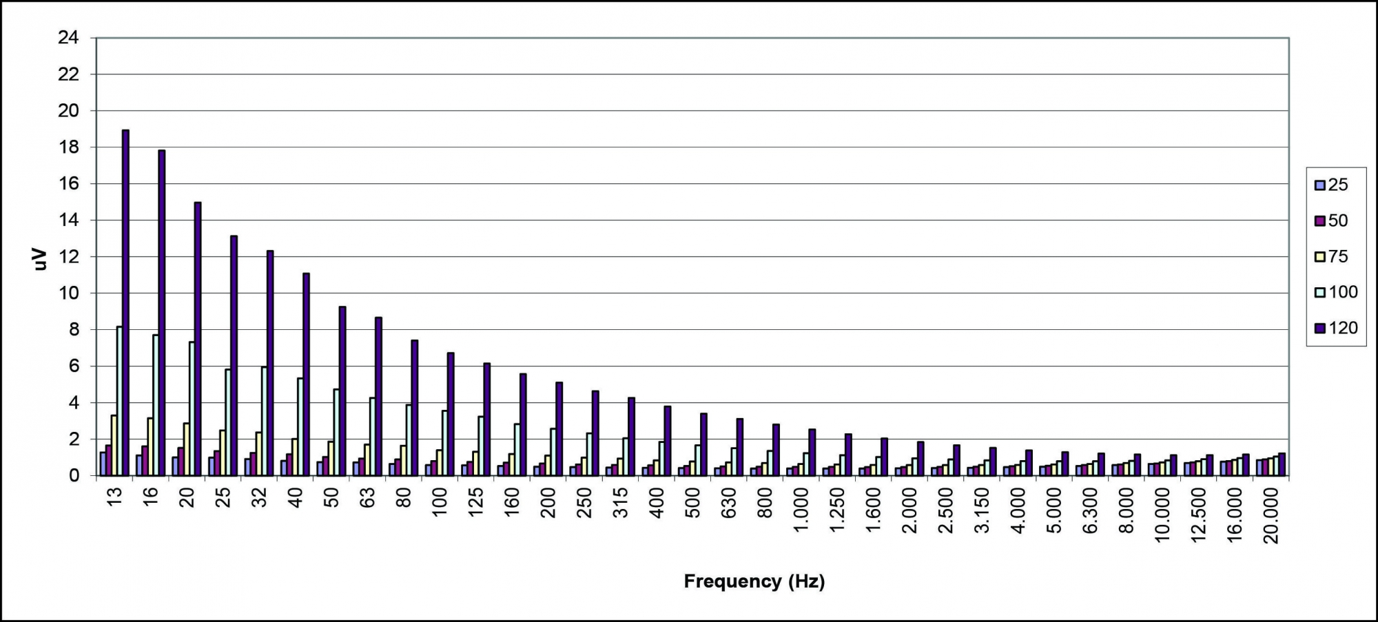 Mức độ tiếng ồn điển hình ở các nhiệt độ 25, 50, 75, 100 và 120 °C, dải tần 1/3 quãng tám.