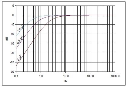 Tần số cắt thấp của bộ tiền khuếch đại GRAS 26AC-1 chủ yếu được xác định bởi trở kháng đầu vào của bộ tiền khuếch đại và điện dung của đầu micro (xem biểu đồ trong phần Thông số kỹ thuật). Các điện dung 20 pF, 6,5 pF và 3 pF tương ứng với điện dung điển hình của các đầu micro 1/2", 1/4" và 1/8". Tần số cắt cao được xác định bởi khả năng của bộ tiền khuếch đại trong việc điều khiển tải điện dung (tốc độ biến đổi tín hiệu), gây ra bởi cáp. Đối với tín hiệu lớn, cần phải tính đến ảnh hưởng của các thông số này khi thực hiện phép đo. Biểu đồ trong phần Thông số kỹ thuật cho thấy đáp ứng tín hiệu lớn của GRAS 26AC-1 đối với các tải điện dung khác nhau tương ứng với các chiều dài cáp khác nhau. Mức đầu ra được tính bằng decibel so với 1 Volt. Điện dung điển hình của cáp là 100 pF/m (30 pF/foot).