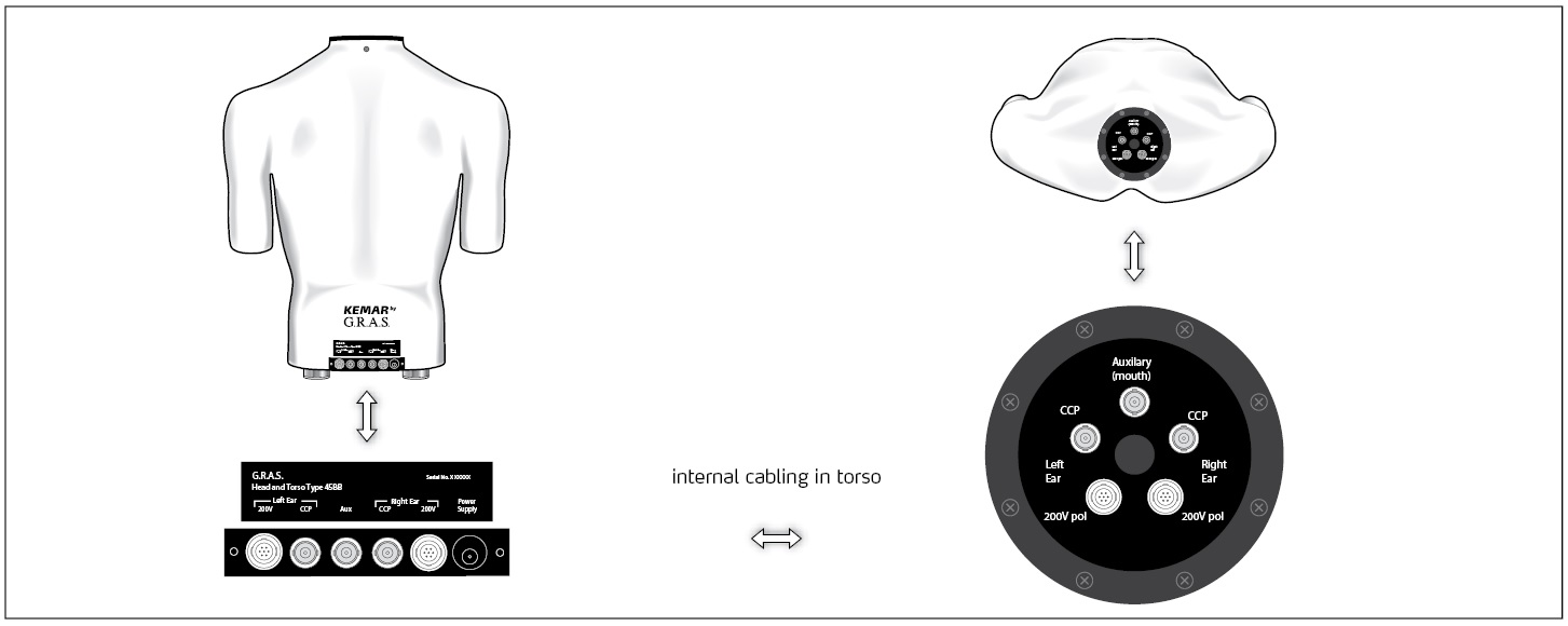 Tất cả dây cáp bên trong đều được lắp đặt sẵn tại nhà máy. Các ổ cắm để kết nối với bộ mô phỏng tai hoặc micro được bố trí dễ dàng ở phía trên cổ, còn các ổ cắm để kết nối với thiết bị đo lường được đặt ở phía dưới lưng.