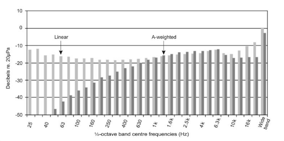 Mức nhiễu nền điển hình được hiển thị trong các dải tần ⅓ quãng tám cho cả trường hợp tuyến tính và trường hợp trọng số A.