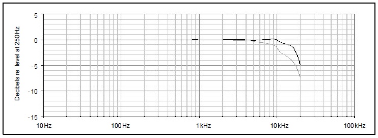 Đáp tuyến tần số điển hình. Đường cong phía trên thể hiện đáp tuyến trong trường âm thanh phân tán (tác động ngẫu nhiên), đường cong phía dưới thể hiện đáp tuyến theo áp suất.