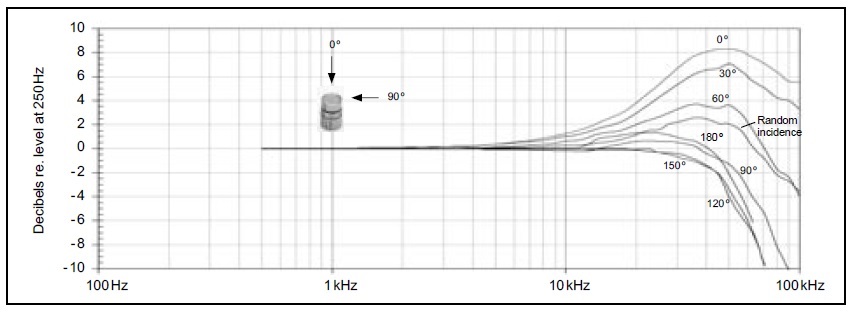 Đáp tuyến tần số điển hình (không có lưới bảo vệ). Đường cong phía trên thể hiện đáp tuyến trường tự do ở 0°, đường cong phía dưới thể hiện đáp tuyến áp suất.